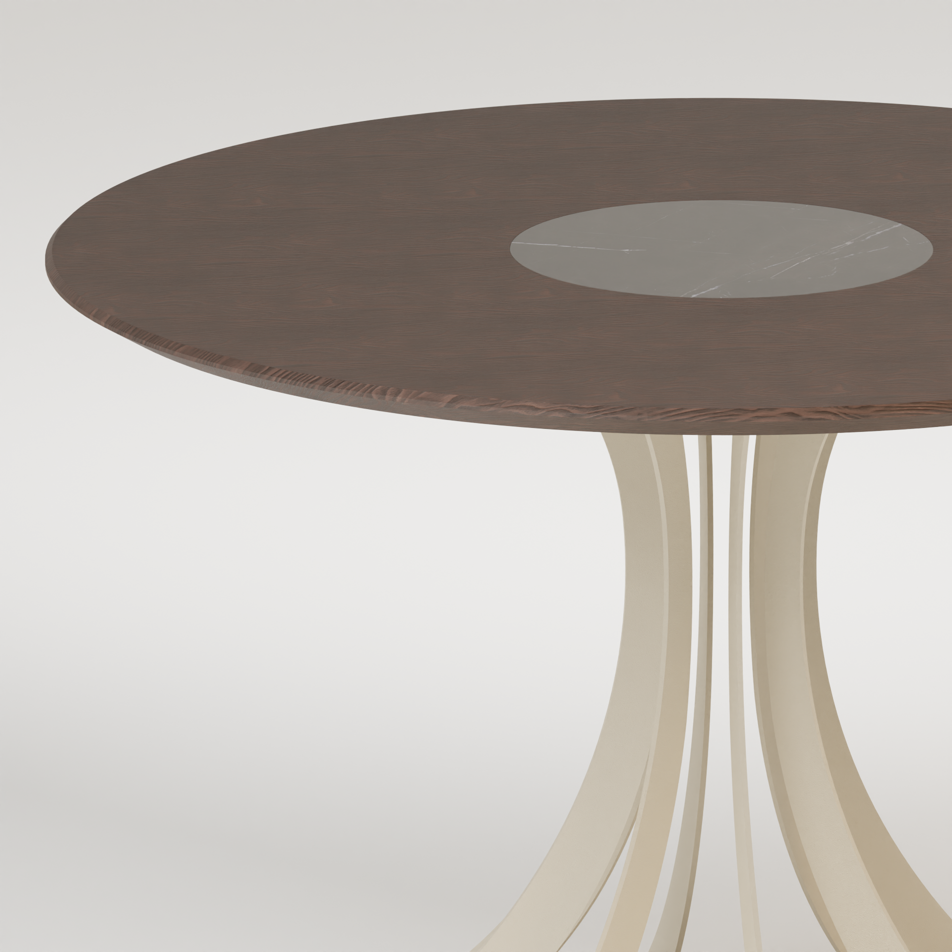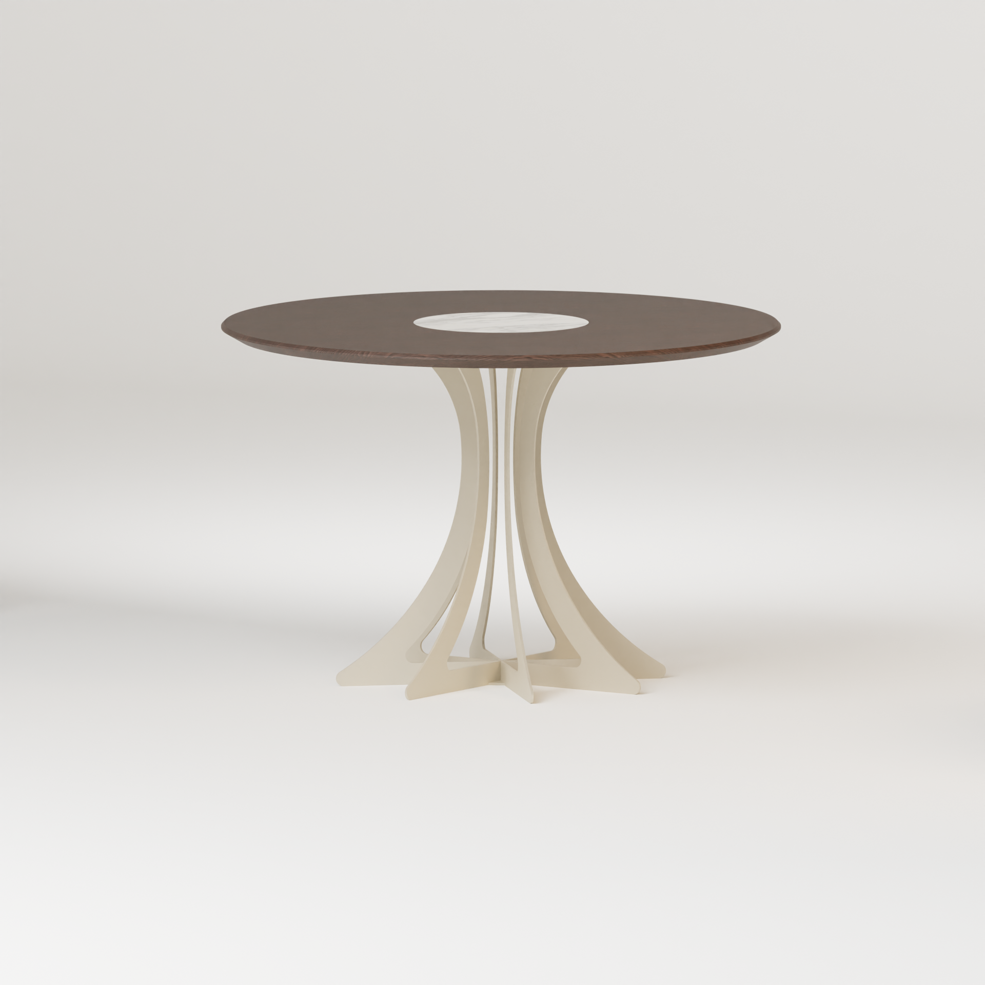 CETTE TABLE FIBONACCI SE DISTINGUE PAR SON PLATEAU CIRCULAIRE EN BOIS, SUBLIMÉ D'UN INSERT CENTRAL EN MARBRE RECYCLÉ, CRÉANT UN CONTRASTE ÉLÉGANT. SON PIÈTEMENT est INSPIRÉ DE LA SÉQUENCE DE FIBONACCI, FORMant UNE BASE SCULPTURALE ALLIANT ESTHÉTIQUE aérienne ET STABILITÉ.